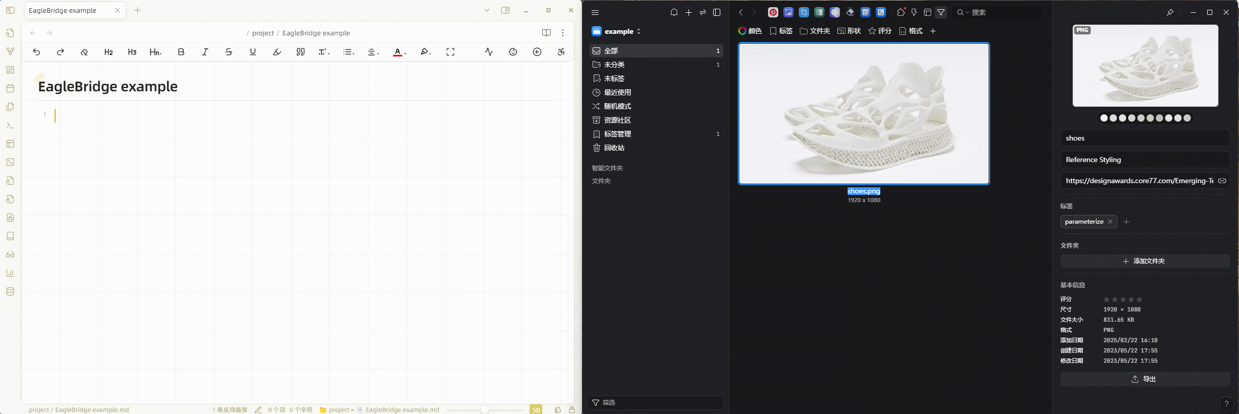 Obsidian-EagleBridge is a plugin for Obsidian that allows you to connect to the Eagle. This plugin includes the following functionalities: Quick eagle attachment navigation in Obsidian , Tag synchronization, File viewing , Attachment management